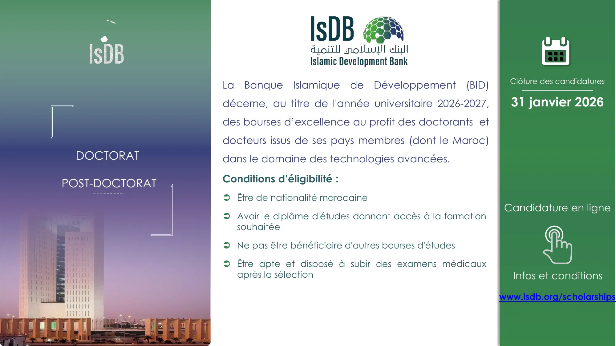 janvier 5, 2026La Banque Islamique de Développement / Programme de bourses d’excellencehttp://www.isdb.org/scholarshipsPlus de détails