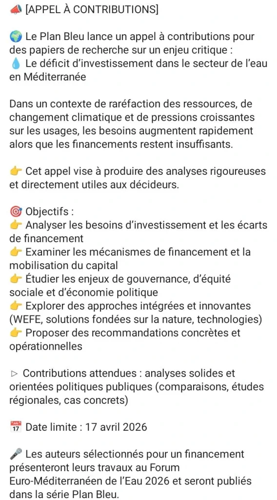 • Call for Papers : Bridging the water Investment gap in the mediterranean Region3 avril 2026
